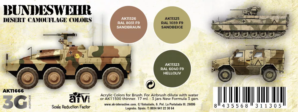 A special set of 3rd Generation acrylic paints including the three camouflage colors that are most commonly used for painting Bundeswehr vehicles used in the desert environment, such as those belonging to the German ISAF contingent in Afghanistan.