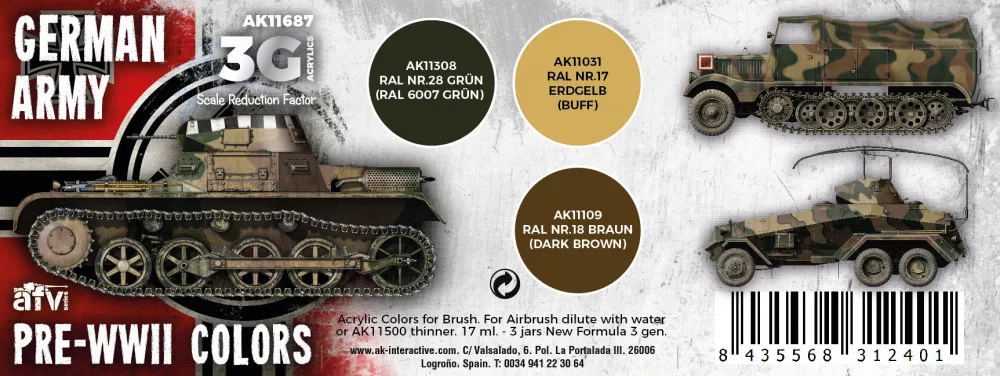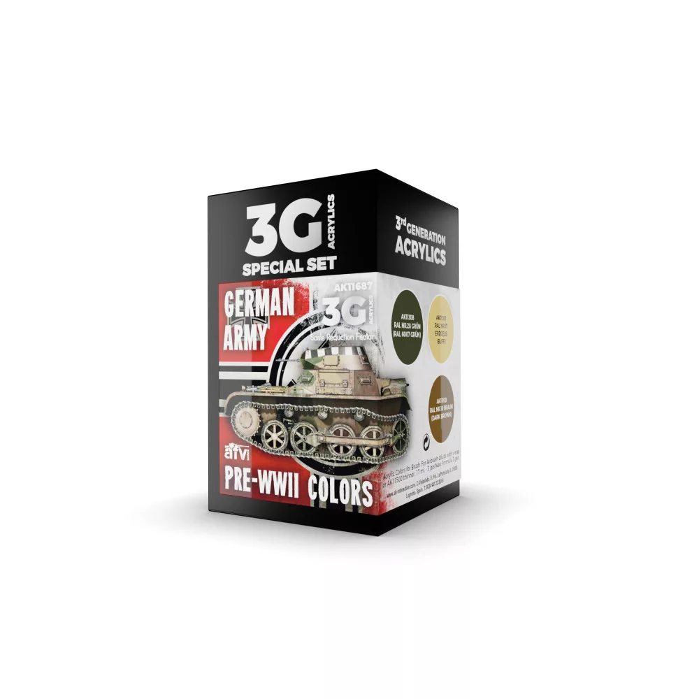 A special set of 3rd Generation acrylic paints including the three standard camouflage colors used for painting German army vehicles from April 1933 until July 1937.
