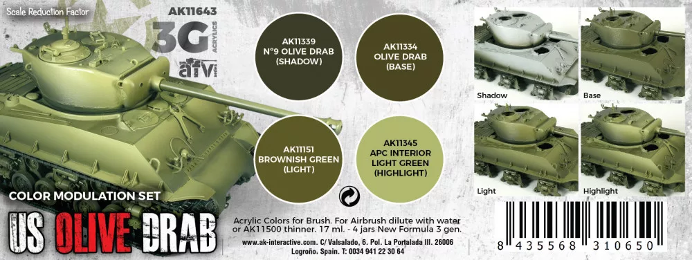 A special set of 3rd Generation acrylic paints intended for finishing Allied vehicles painted in US Olive Drab using the modulation technique.