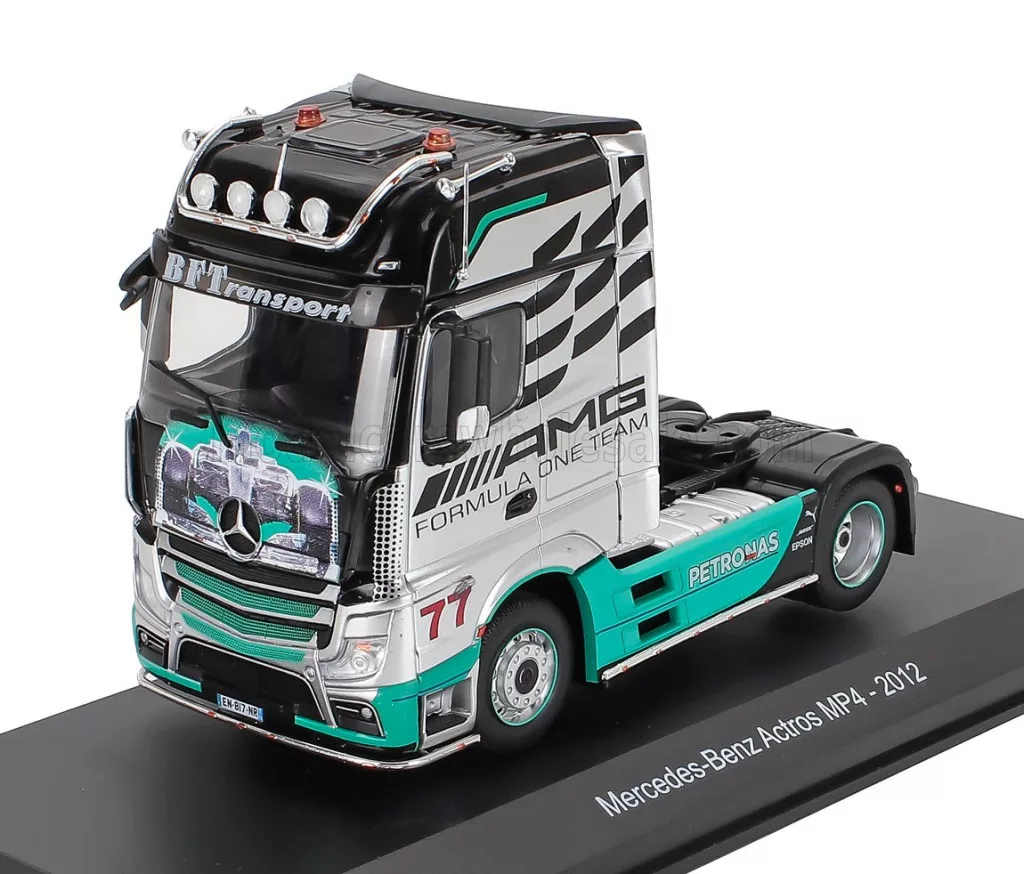 Edicola - MERCEDES BENZ ACTROS MP4 1851 TRUCK N 77 TEAM MERCEDES-AMG PETRONAS F1 FORMULA ONE 2-ASSI 2012 SILVER BLACK GREEN