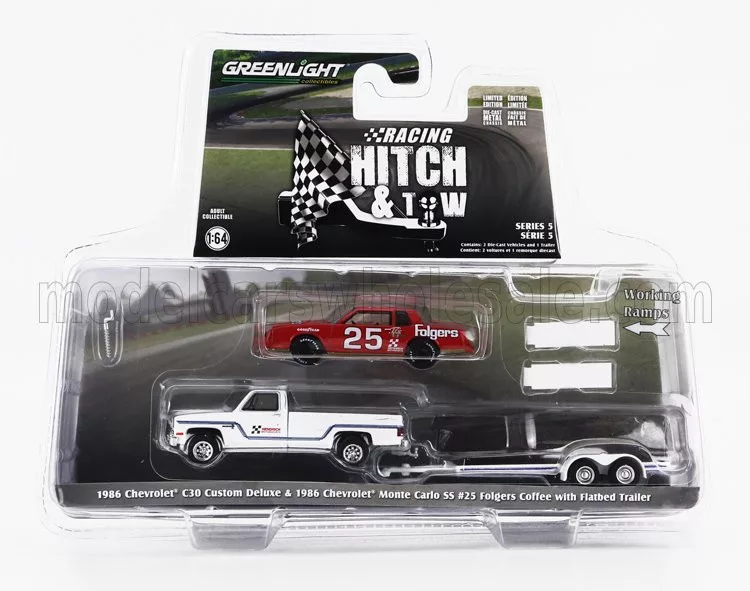 Greenlight - CHEVROLET C-30 PICK-UP CUSTOM DELUXE 1986 WITH TRAILER + MONTE CARLO SS N 25 RACING 1986 WHITE RED