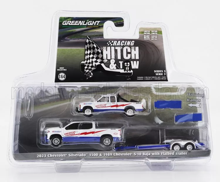Greenlight - CHEVROLET SILVERADO 1500 PICK-UP 2023 WITH TRAILER + S-10 PICK-UP BAJA 1989 WHITE RED BLUE
