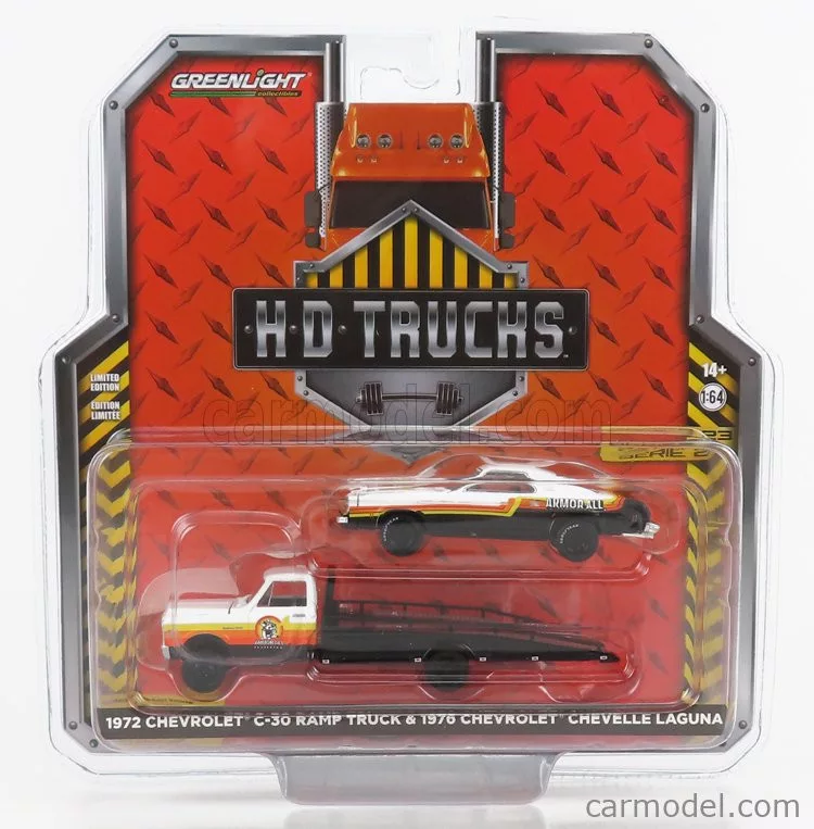 Greenlight - Chevrolet C-30 Ramp Truck Carro Attrezzi - Wrecker Road Service 1972 + Chevelle 1976 White Orange Black