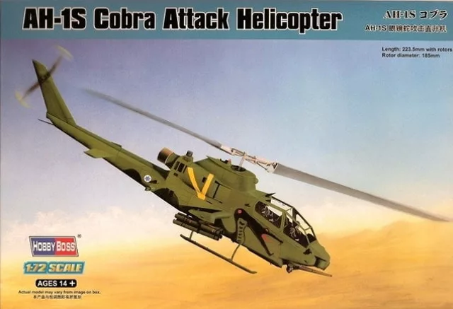 Hobbyboss - Ah-1S Cobra Attack HelicopterThis is a Plastic Model Kit from Hobbyboss. Does not includes glue and paint which is necessary to build this kit.