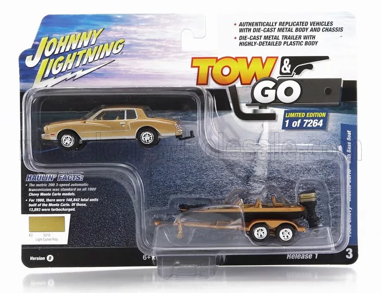 Johnny Lightning - CHEVROLET MONTECARLO 1980 WITH TRAILER AND MOTORBOAT GOLD BLACK