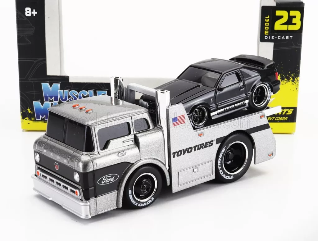 Maisto - FORD USA C600 FLATBED TRUCK CAR TRANSPORTER WITH MUSTANG SVT COBRA COUPE TOYO TIRES CUSTOM 1993 SILVER BLACK