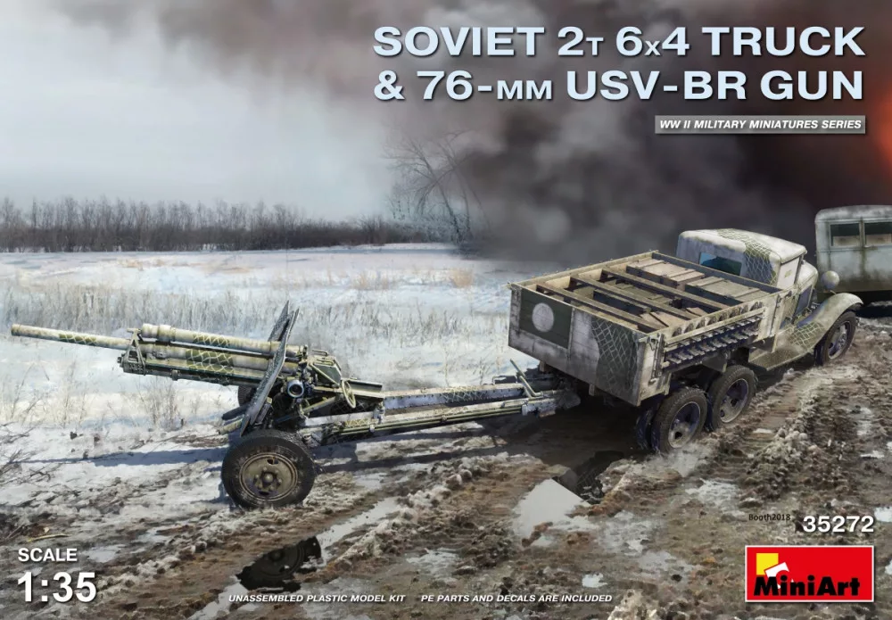 Miniart - Soviet 2t 6x4 Truck with 76 mm USV-BR GunThis is a Plastic Model Kit from Miniart. Does not includes glue and paint which is necessary to build this kit.